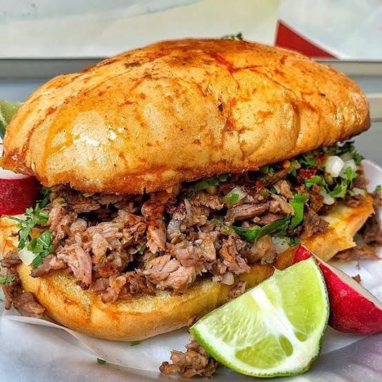 Torta de birria, adobada o chilorio con queso (verdura y salsa adicional).