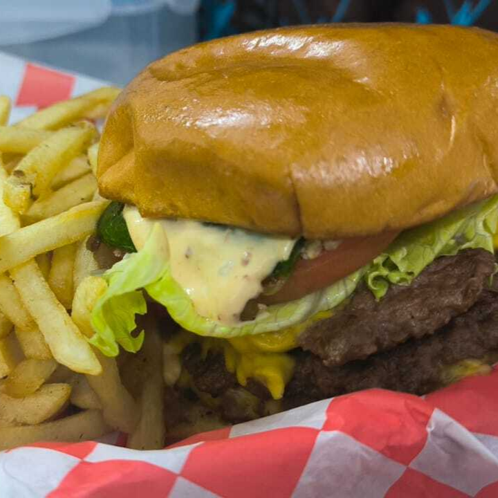 2 carnes de 100gr, Queso, Lechuga, Tomate, Cebolla Caramelizada, Aderezo de la Casa y porcion de papas