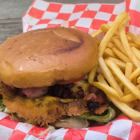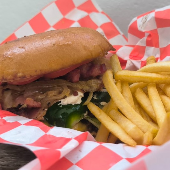 100 gramos de carne con chiltepin y habanero. Queso amarillo,1 chile relleno relleno de queso crema envuelto en tocino,lechuga,tomate,cebolla caramelizada,aderezo de la casa.
