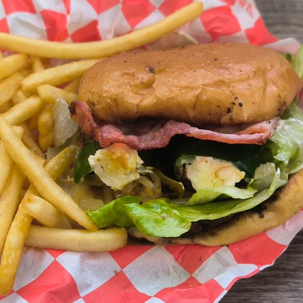 Triple carne de 100 gramos. Queso americano, 1 chile relleno de queso crema envuelto en tocino, lechuga, tomate, cebolla caramelizada, aderezo de la casa.