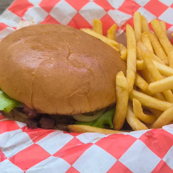 100 gramos carne. Queso americano,tocino,lechuga,tomate,cebolla caramelizada,aderezo de la casa.