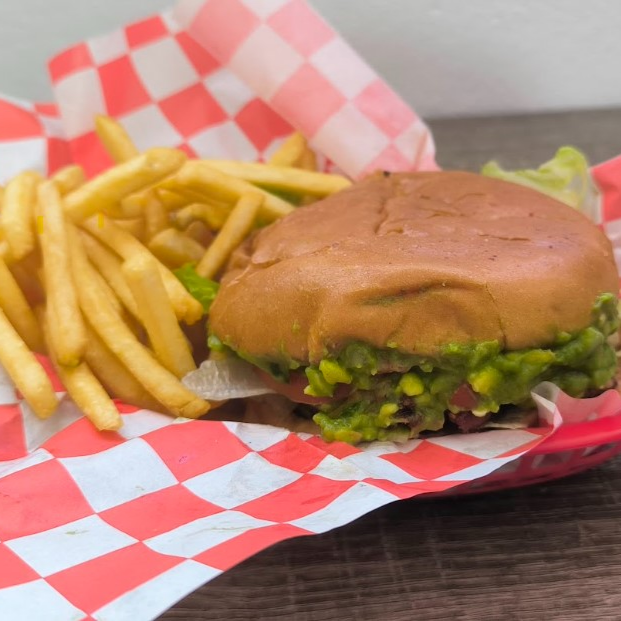100 gramos de carne. Queso americano, guacamole tradicional,lechuga, tomate, cebolla caramelizada, aderezo de la casa.