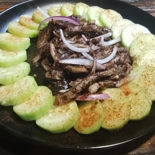 Tiras de diezmillo bañadas en salsa negra de la casa, acompañado de pepinos y cebolla morada