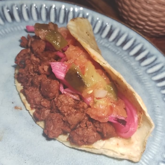 Tortilla de maiz con flor de jamaica y soya estilo carne