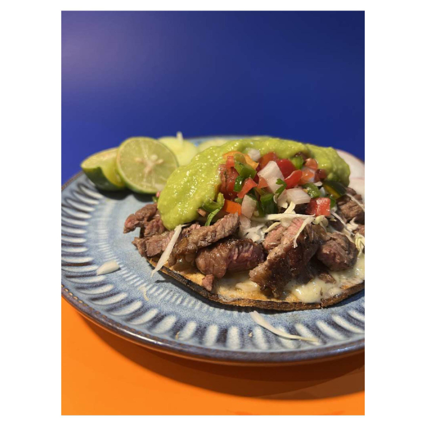Tostada crujiente de maíz con queso y carne asada
