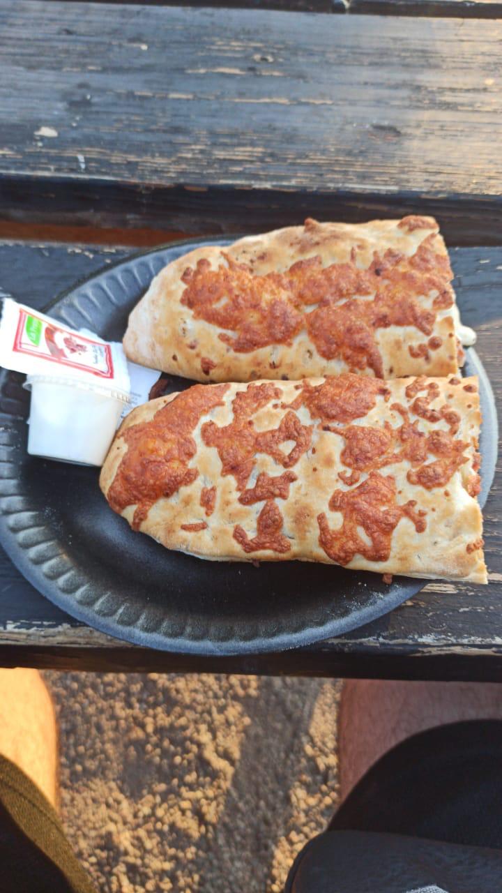 Masa de pizza en burrito con aderezo césar, tocino, cebolla y pollo especiado.