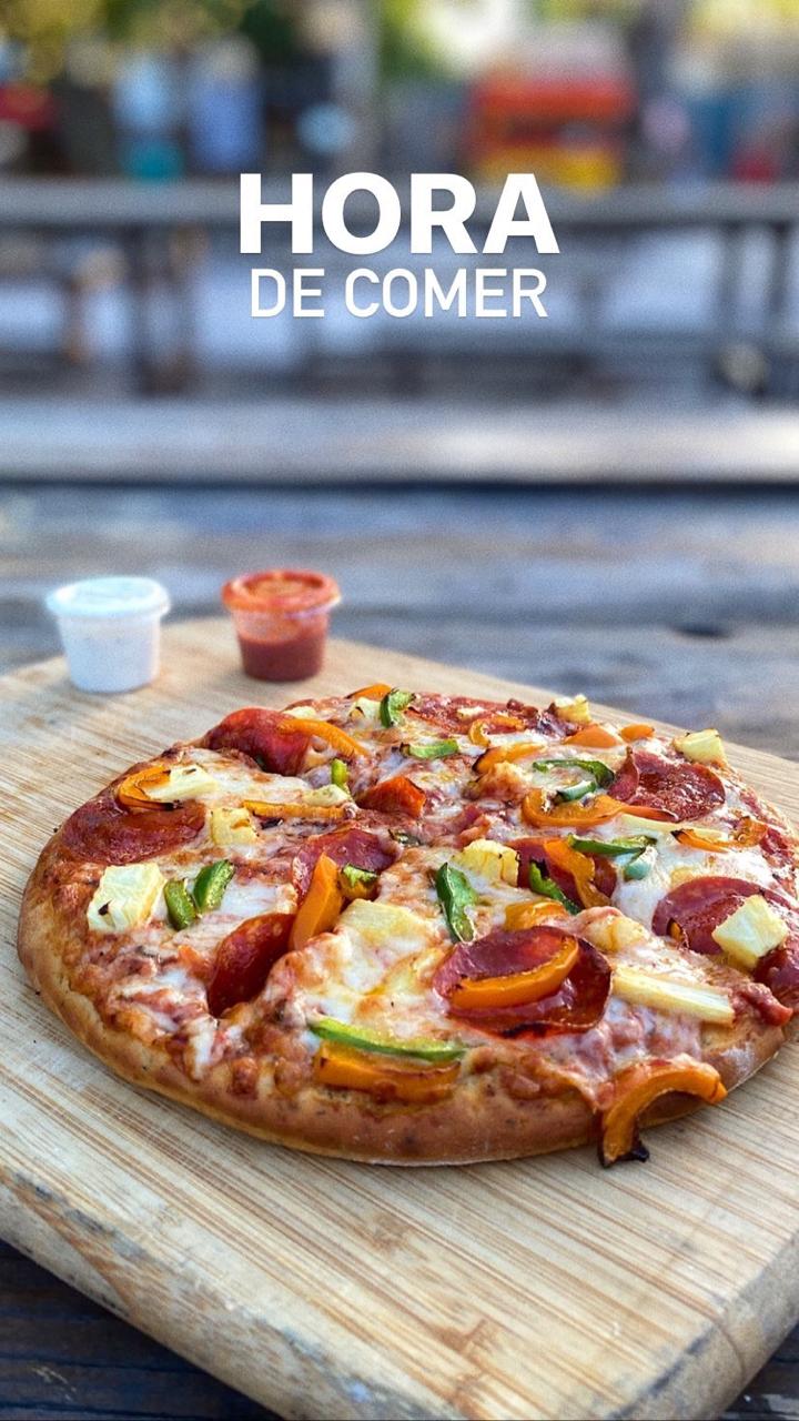 Individual 8", pizza con base de crema blanca espaciada, carne adobada, queso salsa bandera y piña.