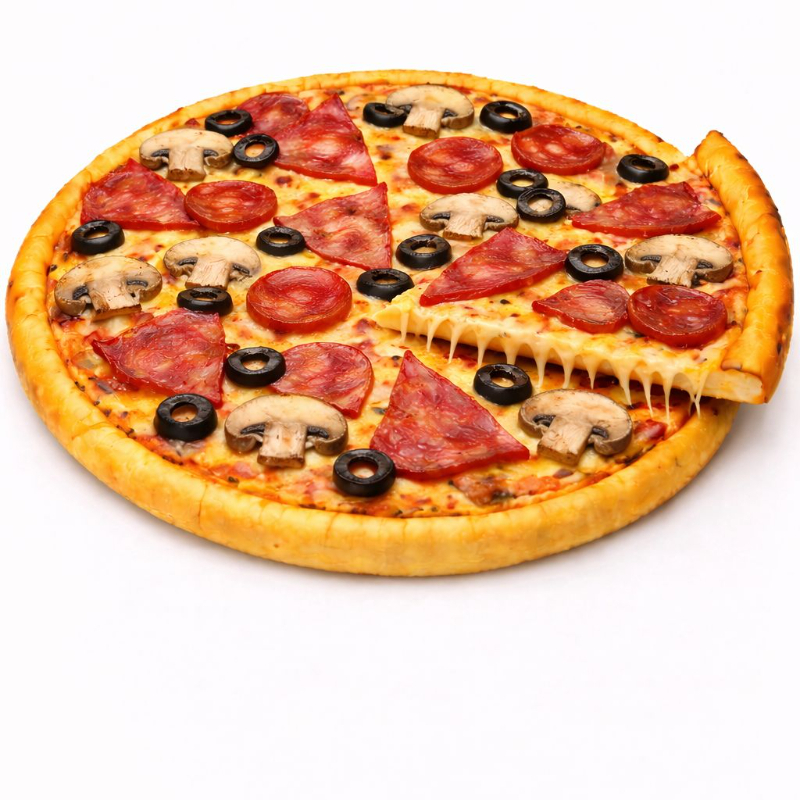 14" Familiar, Pepperoni, salchicha italiana, champiñón, pimiento verde y aceituna negra.