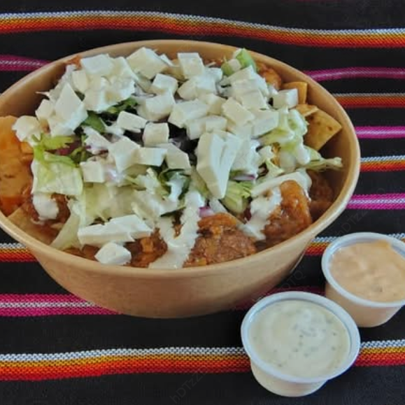 120 gr de Totopos de maíz, Bañados en Salsa de tu Eleccion Roja, Verde, Mixta. Toppings: Crema, Cebolla, Cilantro, Queso Regional, Queso Chihuahua, Porcion de Salsa Picante.