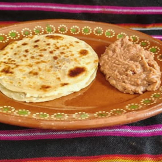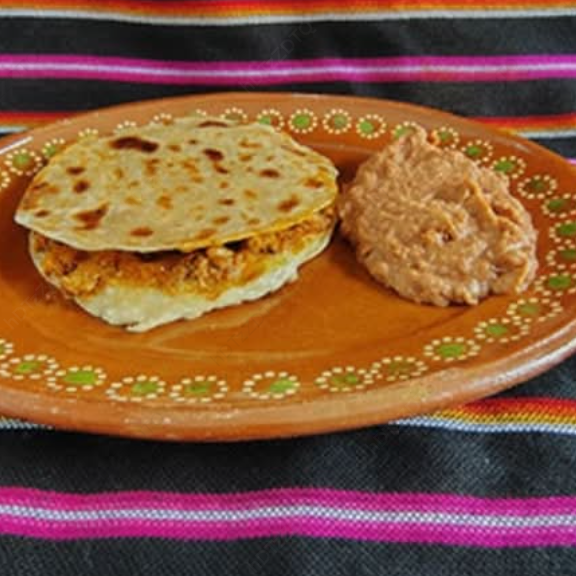 Tortilla de Harina Gordita Tradicional Sonorense, 100 gr. de Queso Chihuahua, acompañada de porción de Frijoles refritos.