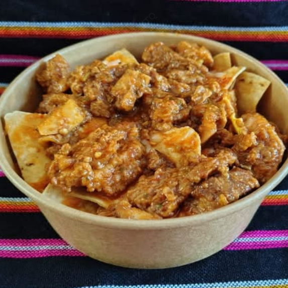 120 gr de Totopos de maíz, 60gr de Salsa de tu Eleccion Roja, Verde, Mixta. 80 gr Porcion de Cualquier Guiso (Barbacoa de Res, Pollo, Chicharrón en Salsa Roja, Cochinita de Puerco, Birria de Res, Cabeza), Toppings: Crema, Cebolla, Cilantro, Queso Regional, Queso Chihuahua, Porción de Salsa Picante.