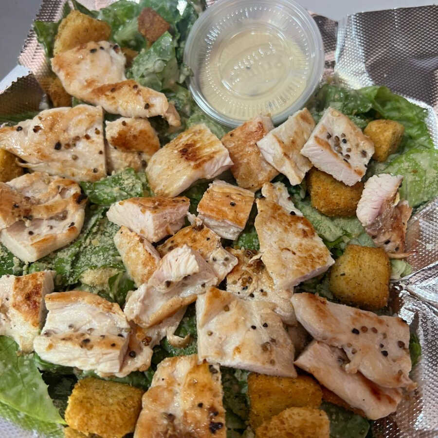 Ensalada cesar con pechuga a la plancha y aderezo.