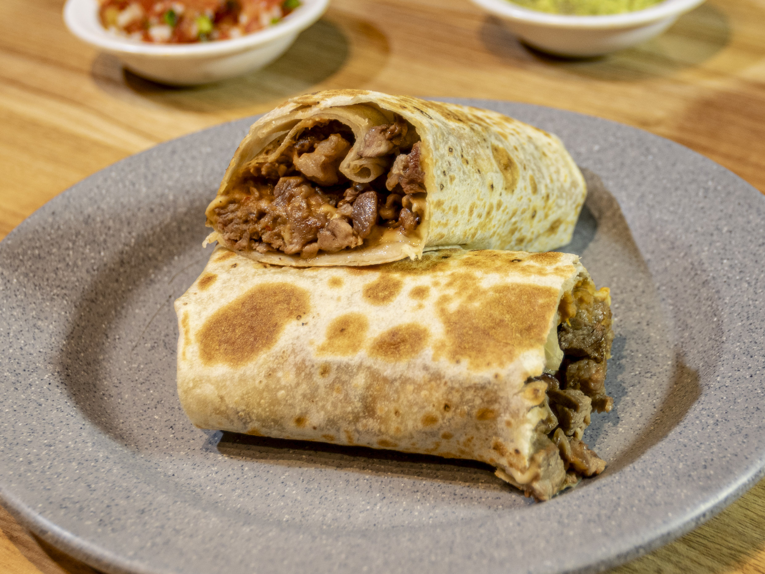 Doble tortilla con queso, carne asada, acompañada con frijoles refritos. Todos nuestros envíos llevan verduras y salsas para acompañar su pedido.