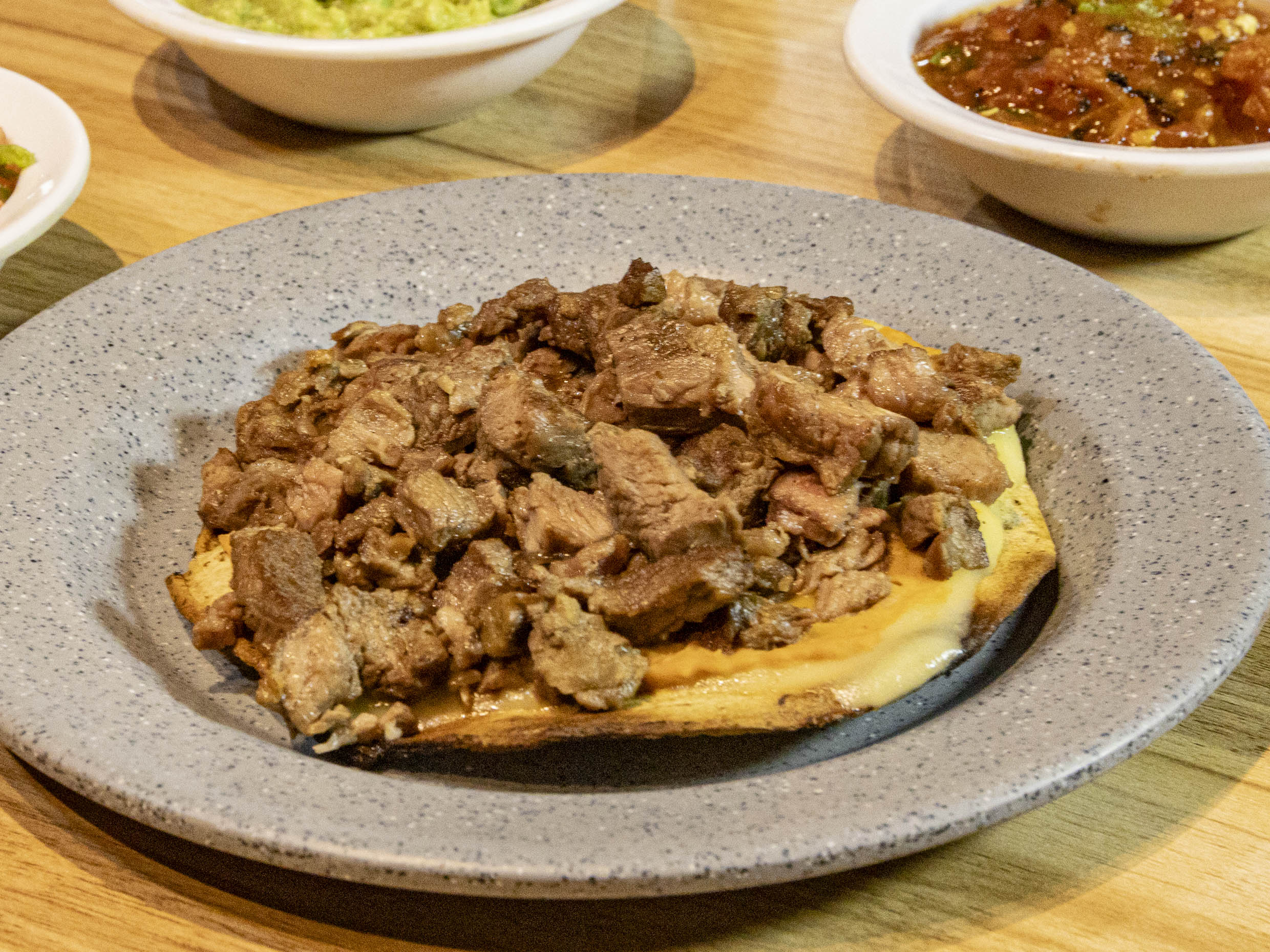 Tostada de maíz con queso carne asada y frijol.