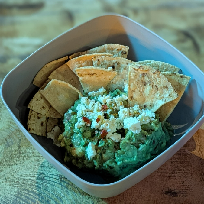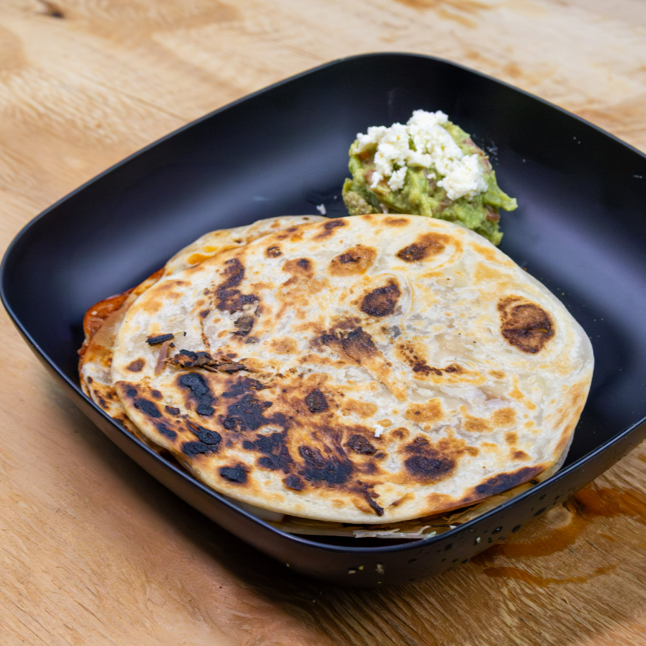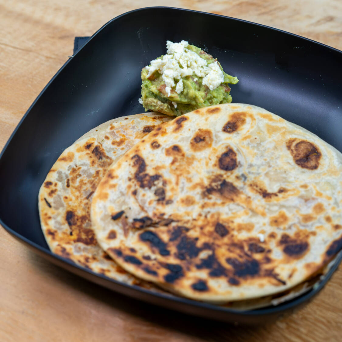 2 dobles en tortilla gordita, rellenas de queso, frijoles y carne con chile (120grs), acompañadas de guacamole