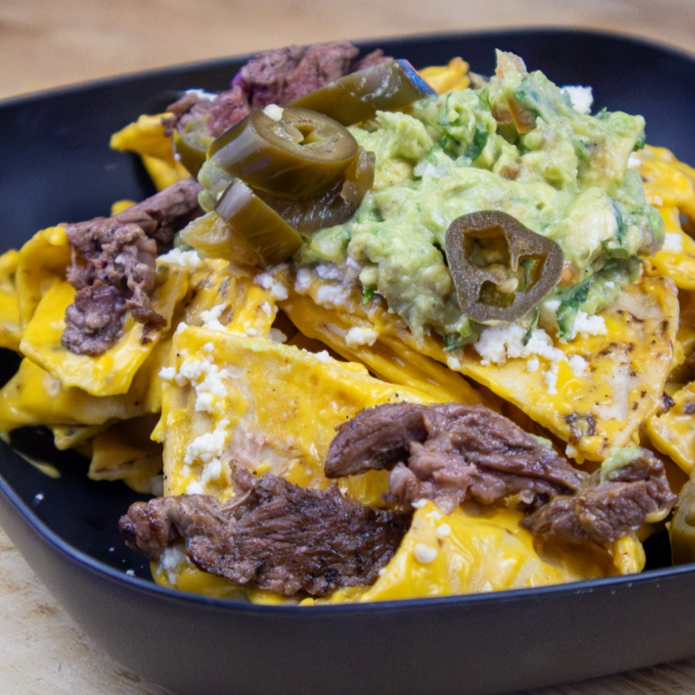 Salsa de 3 quesos, guacamole, queso fresco, chiles jalapeños y arrachera