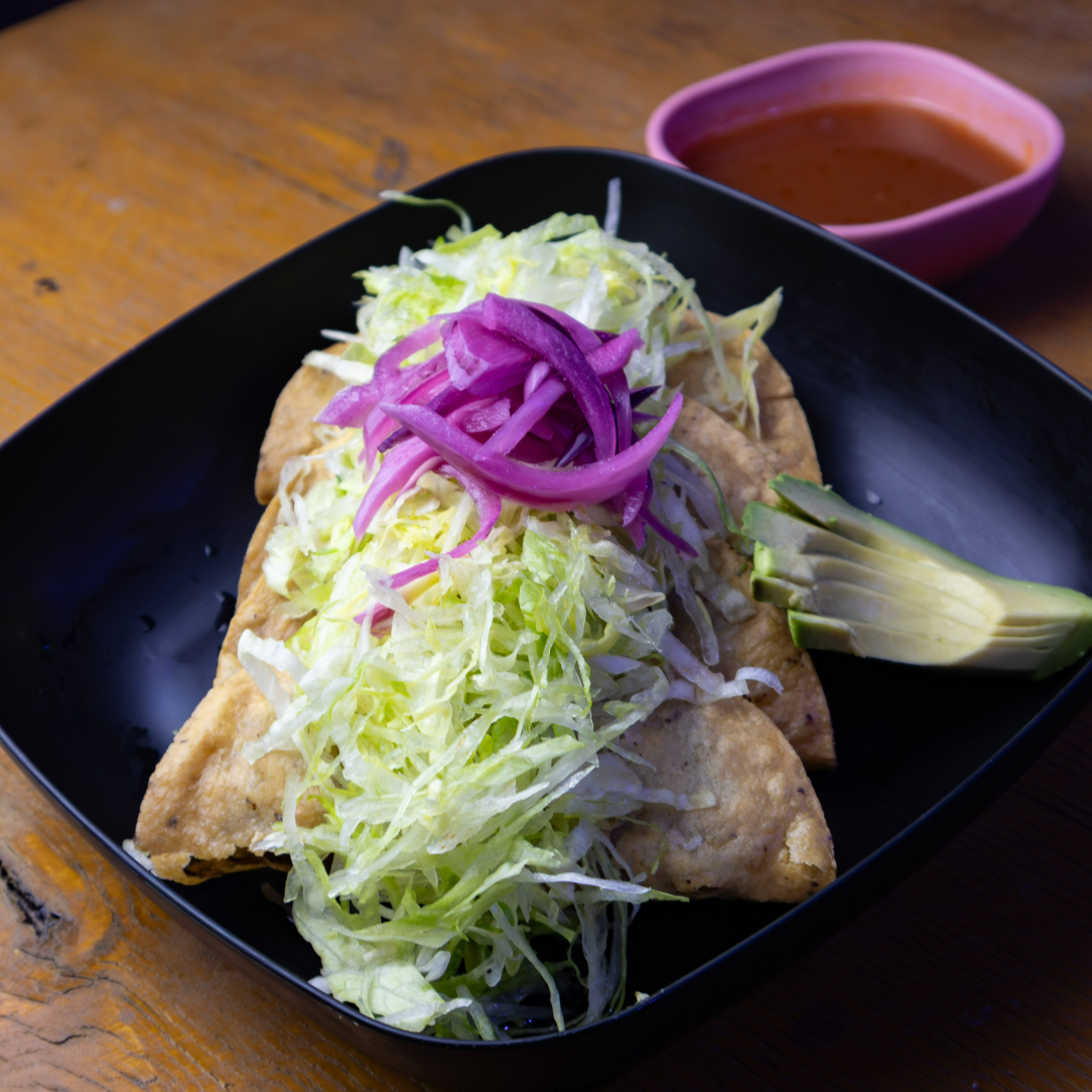 4 piezas rellenos de puré de papa (200 grs), lechuga, cebolla morada curtida, aguacate, consomé de res y tomate