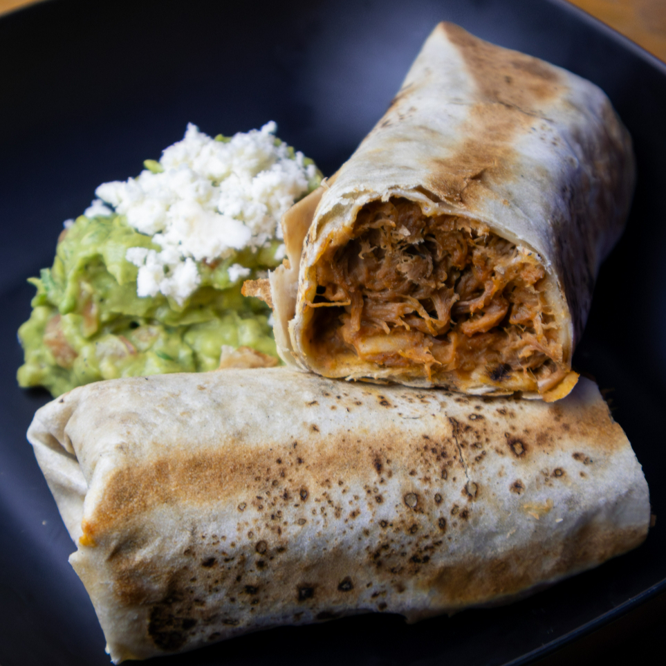 Tortilla Sobaquera, por dentro carne con chile (200grs) y frijoles, por fuera acompañado de guacamole y queso fresco