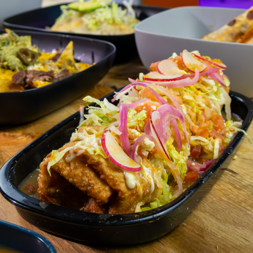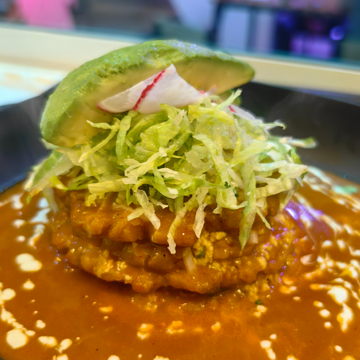 Torre de gorditas, rellenas de queso fresco, cebolla con cilantro, bañadas en chile colorado, acompañadas de lechuga, rábano, crema y aguacate