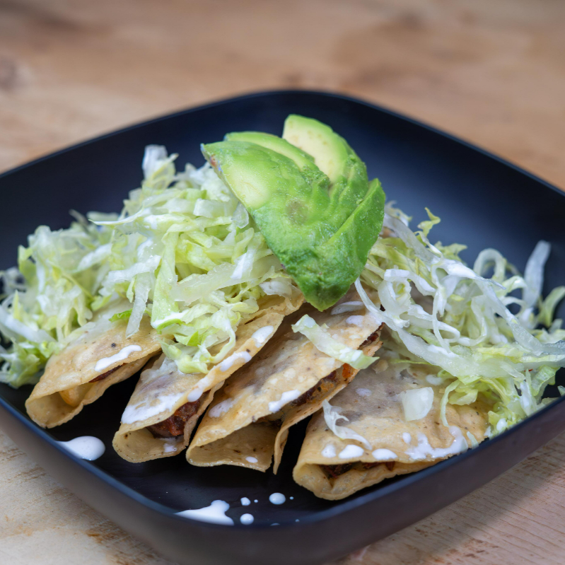 Rellenos de Carne deshebrada de res y papa (200gr), lechuga, crema, queso fresco, aguacate, consomé de res y tomate