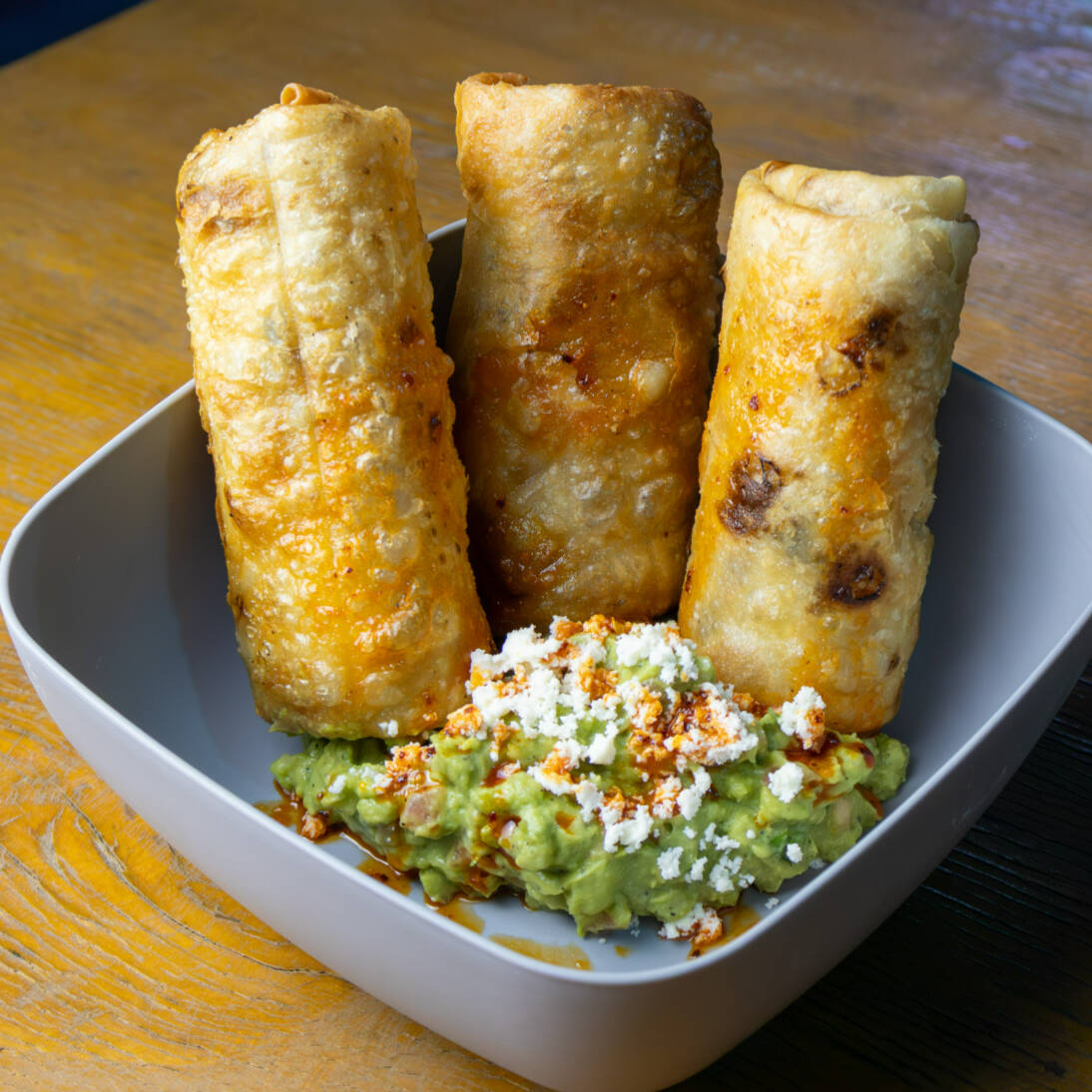 3 mini chivichangas rellenas 1 deshebrada con papas (60grs), 1 queso fresco con rajas (60 grs), 1 pollo con rajas de chile verde (60grs), sobre cama de guacamole, queso fresco y aceite de chiles.