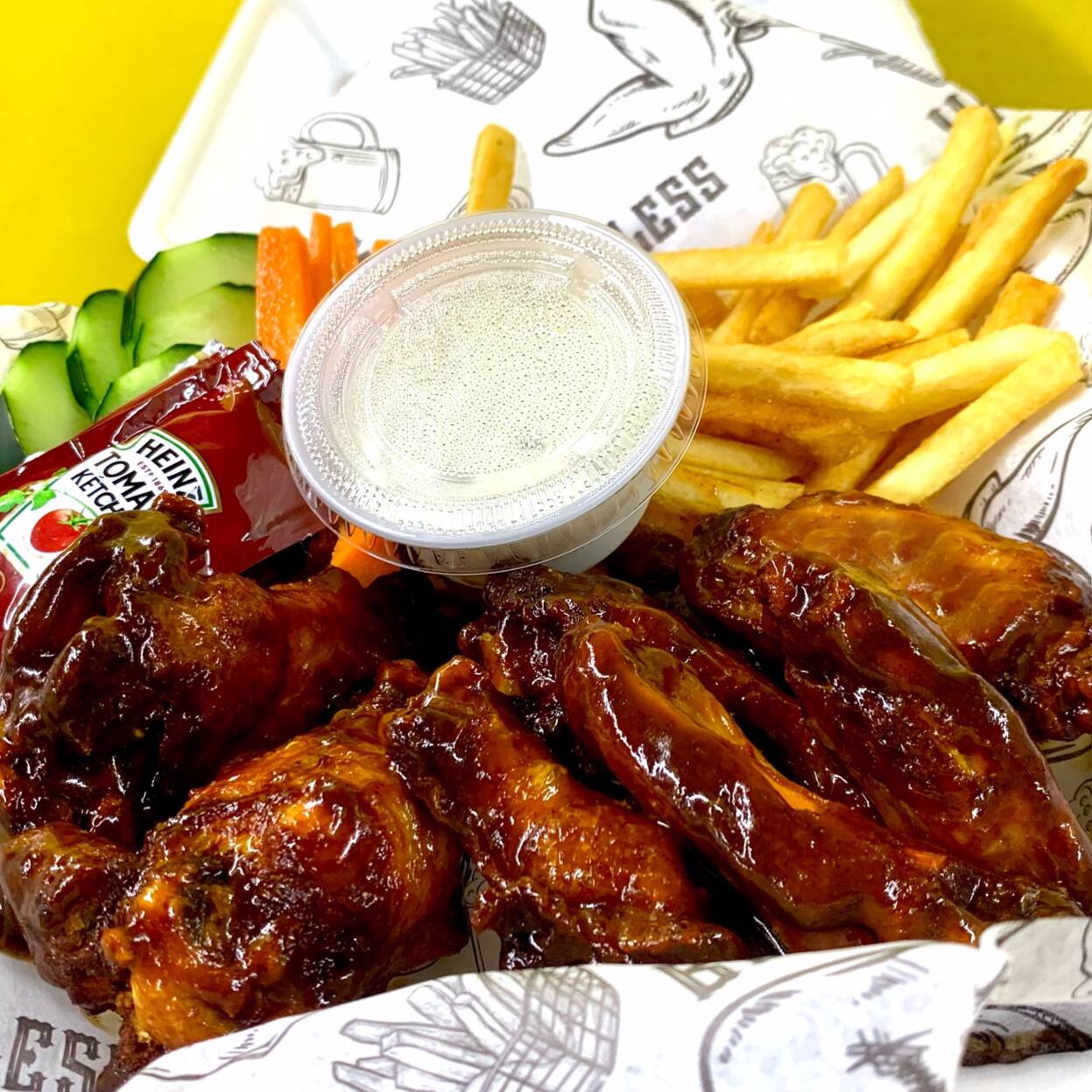 1kg de bonless bañados en nuestras salsas, incluye 4 aderezos Ranch y sus verduras