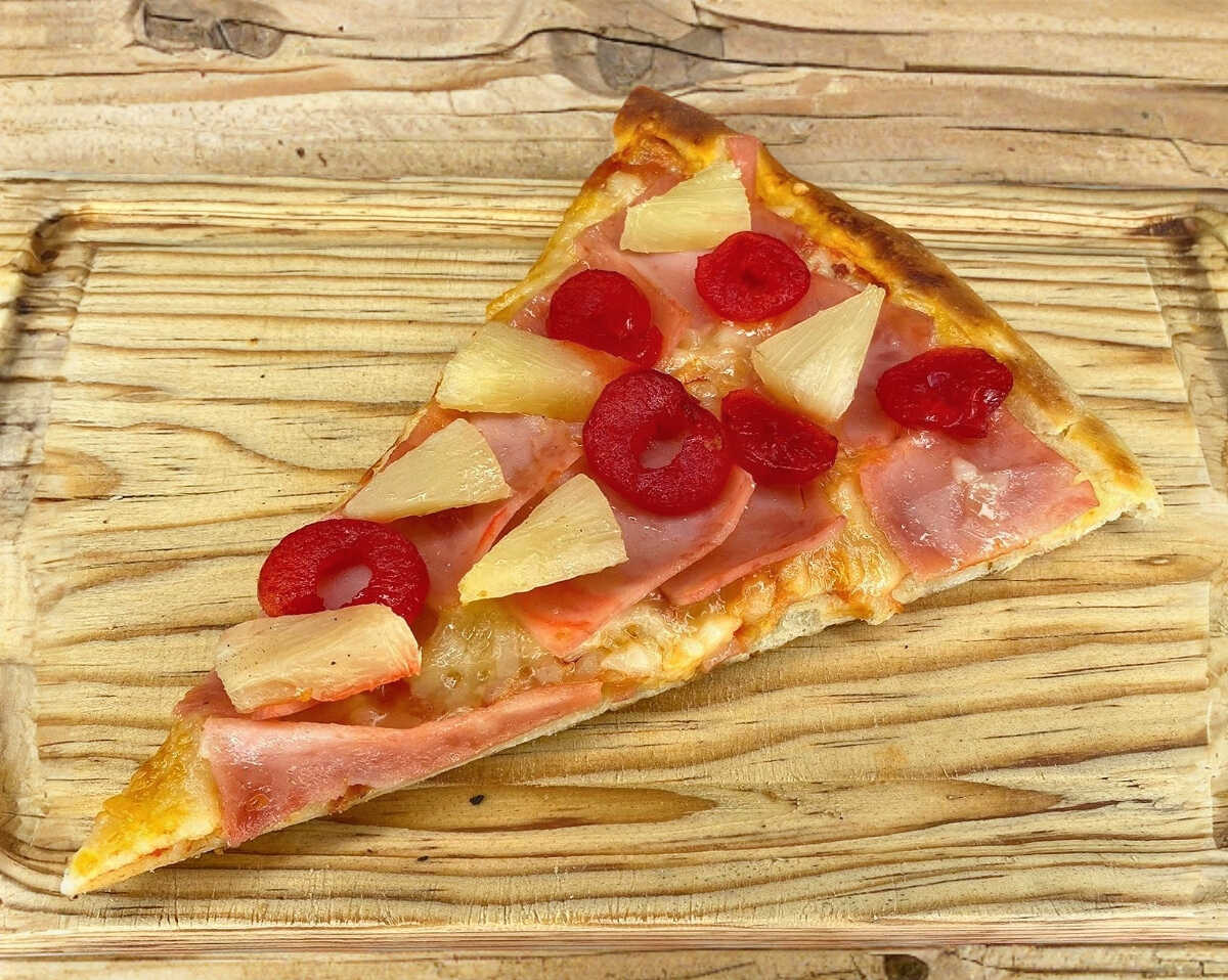 Pizza grande o familiar a elegir, ingredientes: jamón, piña y cereza.