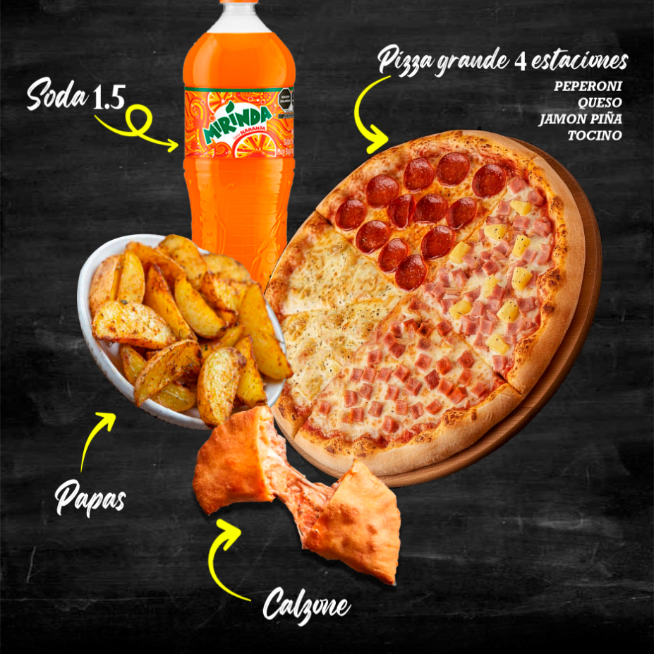 Pizza 4 estaciones: peperoni, hawaiiana, queso y tocino + papas + soda 1.5 L + calzone