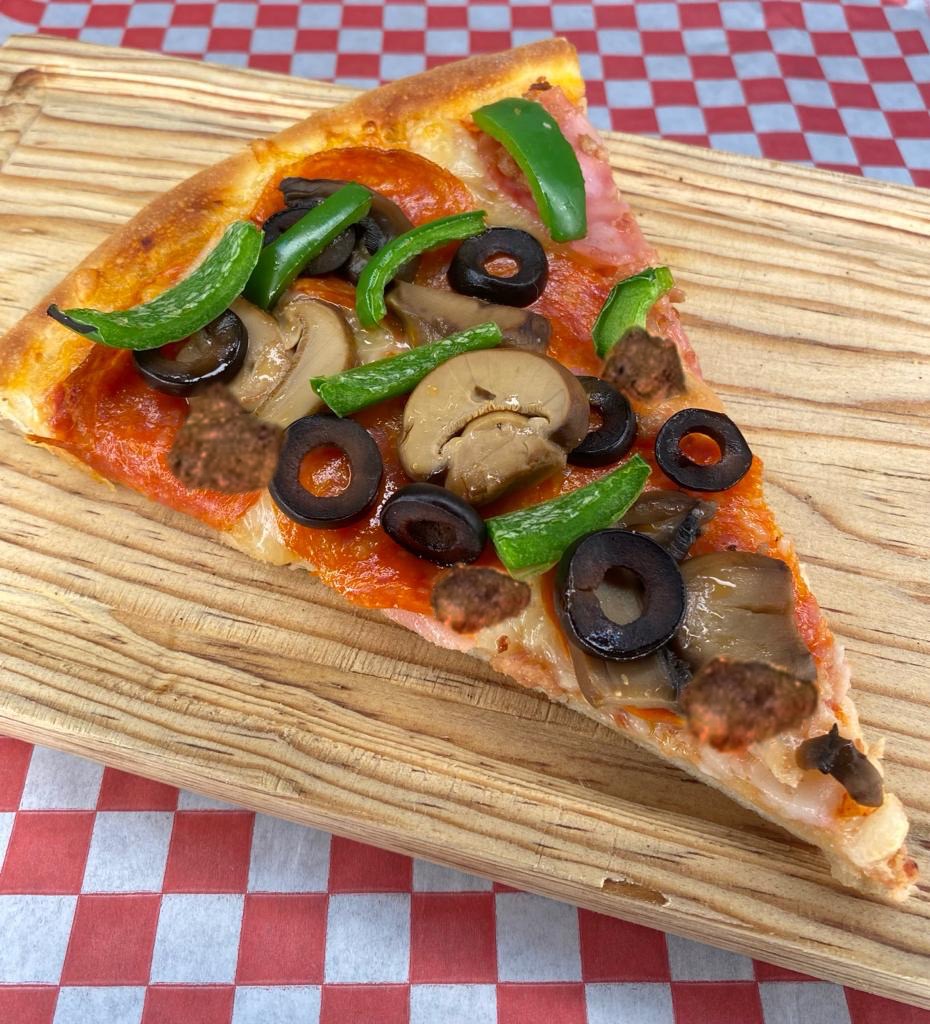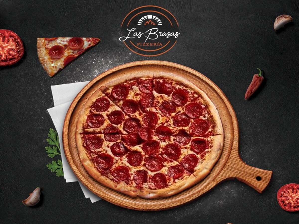 Pizza grande o familiar a elegir, ingredientes: pepperoni, salchicha italiana, champiñón, aceitunas negras y pimiento morrón.