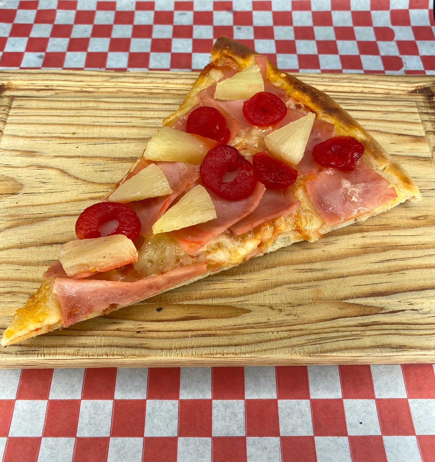 Pizza grande o familiar a elegir, ingredientes: jamón, piña y cereza.