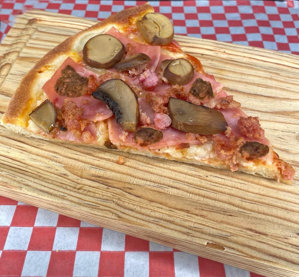 Pizza grande o familiar a elegir, ingredientes: jamón, salchicha italiana, tocino y champiñón.
