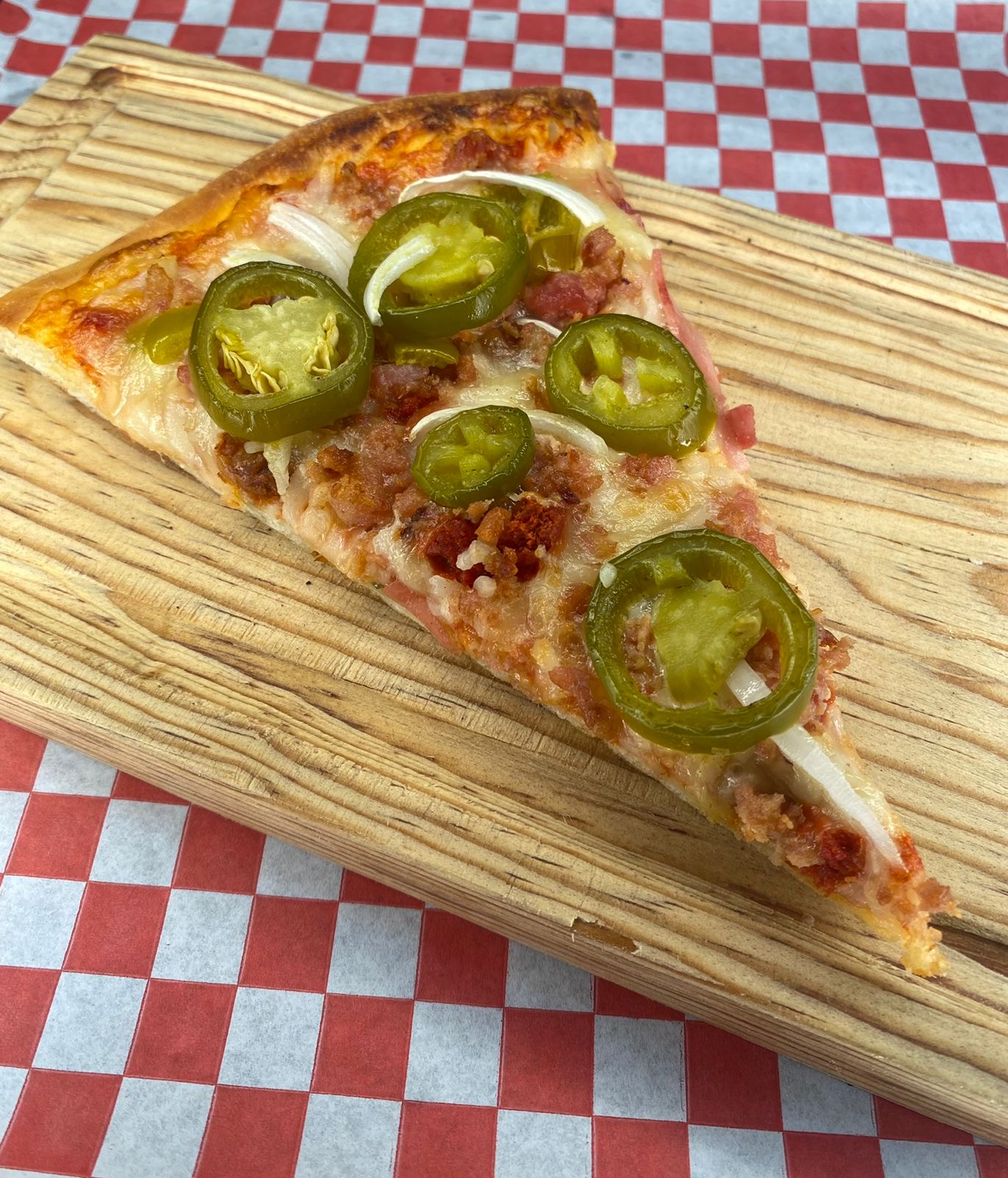 Pizza grande o familiar a elegir, ingredientes: chorizo, frijol, tocino, jalapeño y cebolla.