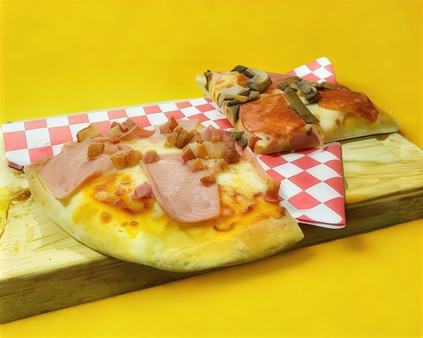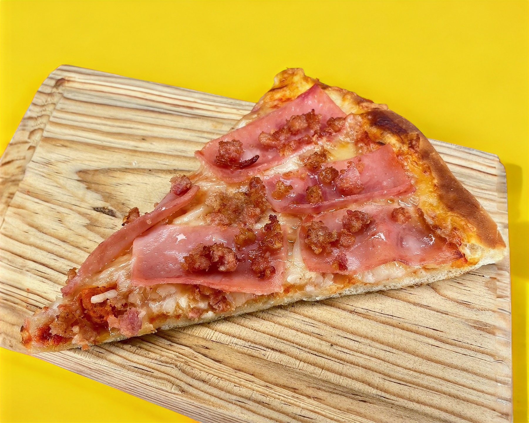 Pizza grande o familiar a elegir, ingredientes: jamón y tocino.