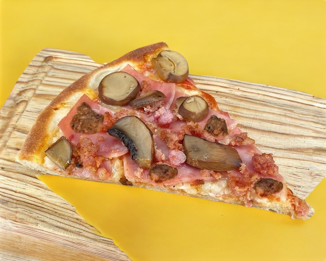 Pizza grande o familiar a elegir, ingredientes: jamón, salchicha italiana, tocino y champiñón.