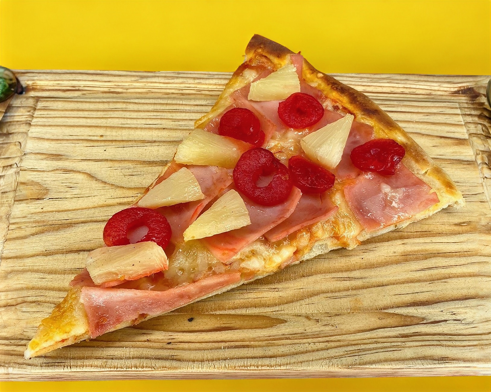 Pizza grande o familiar a elegir, ingredientes: jamón, piña y cereza.