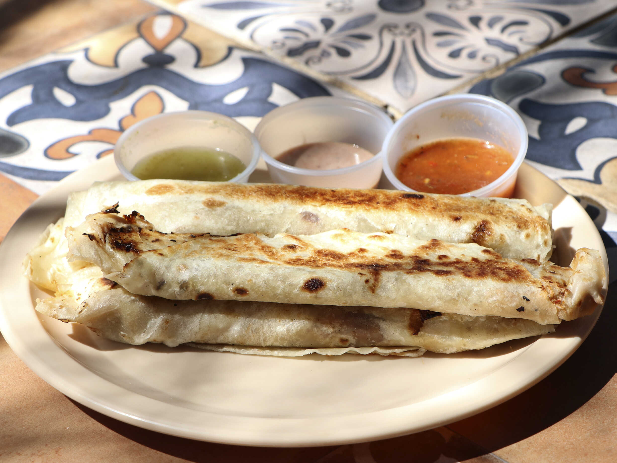 BURRITOS LONCHEROS EN TORTILLA DE HARINA PASADOS POR EL COMAL DE DELICIOSA MACHACA CON PAPAS Y VERDURAS( 3 DE GUISOS Y UNO DE FRIJOL) ACOMPAÑADOS POR SALSA ROJA O VERDE
