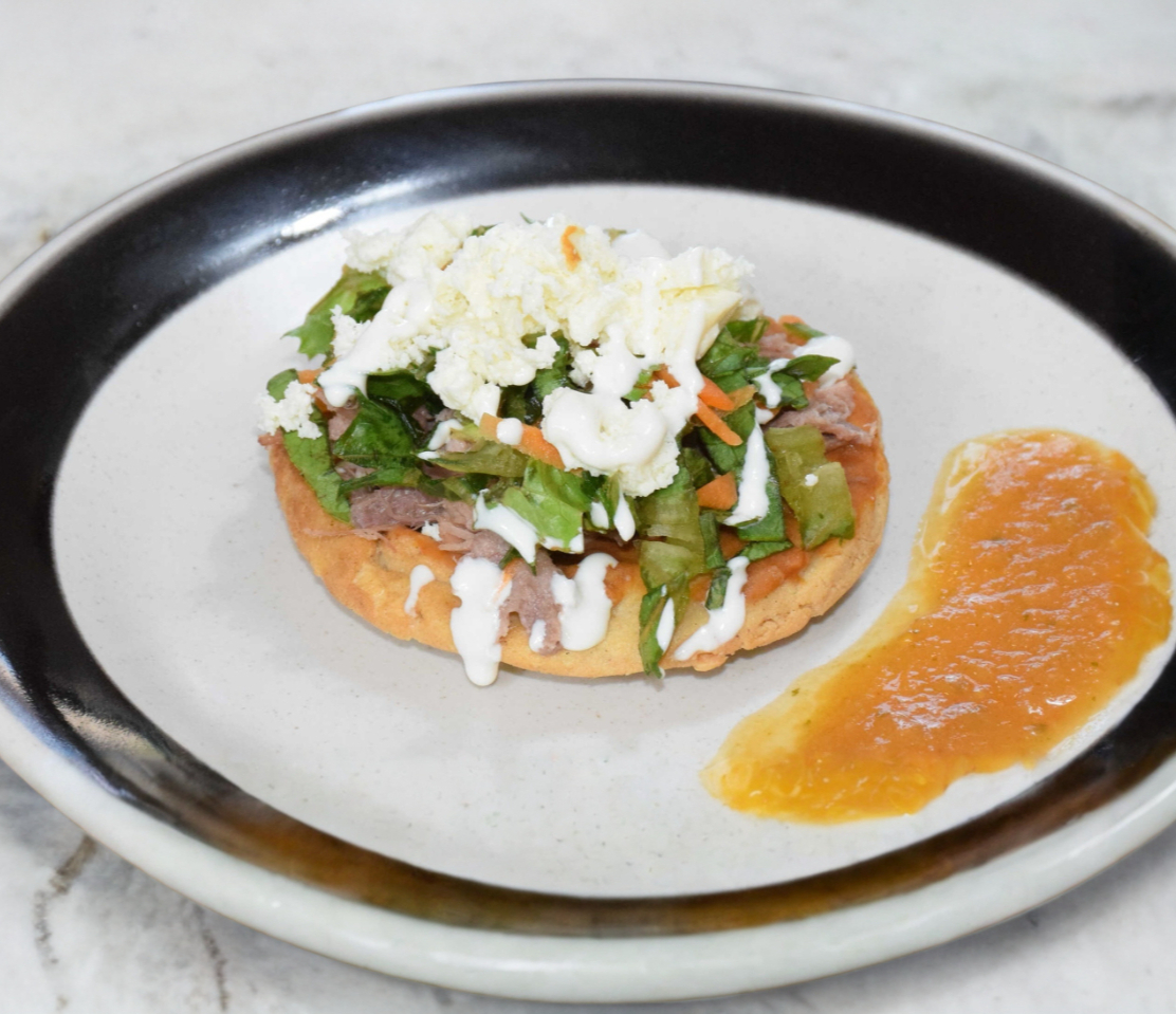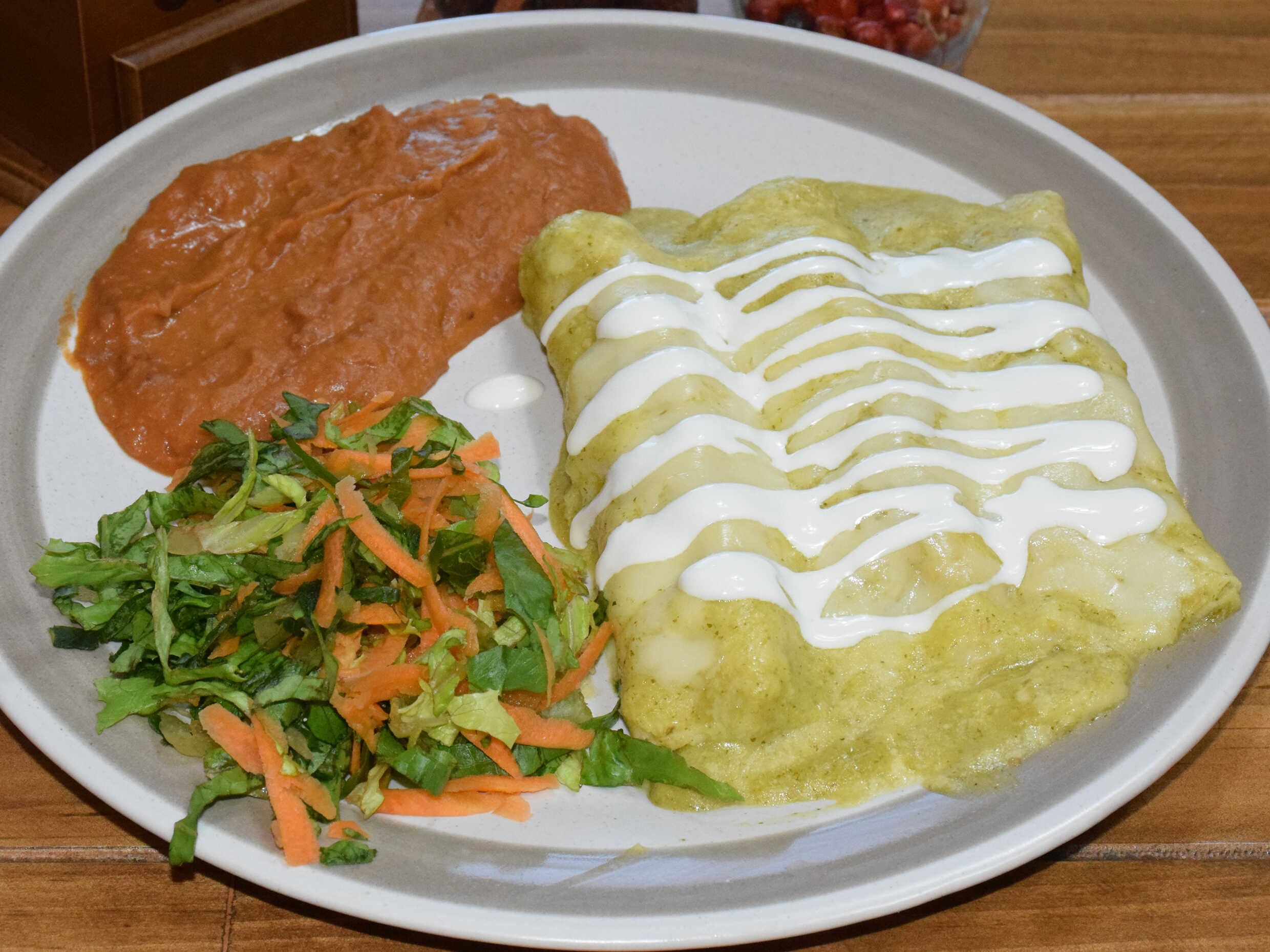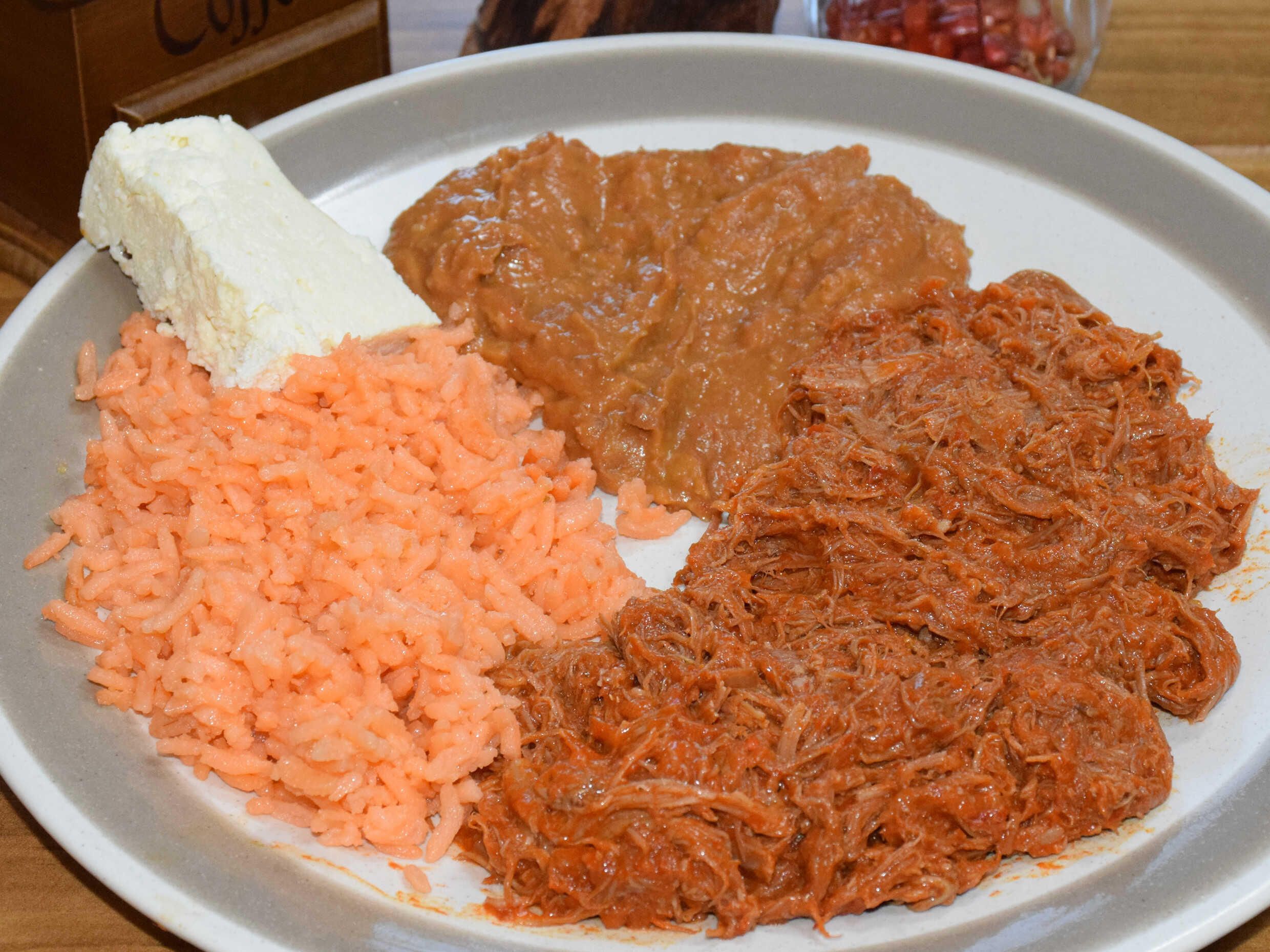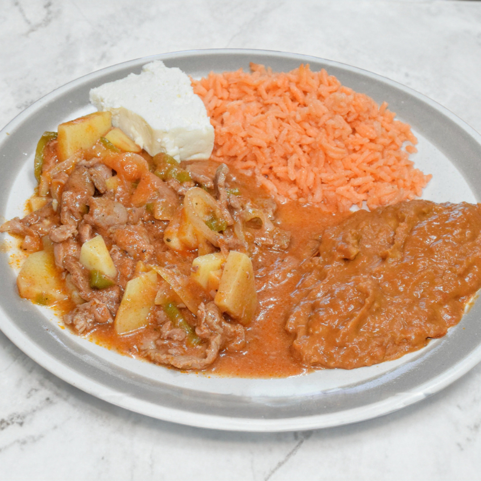 litro de guiso de su eleccion, carne con chile, bisteck ranchero o machaca.