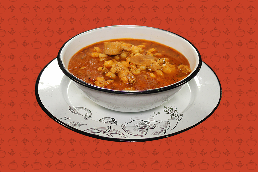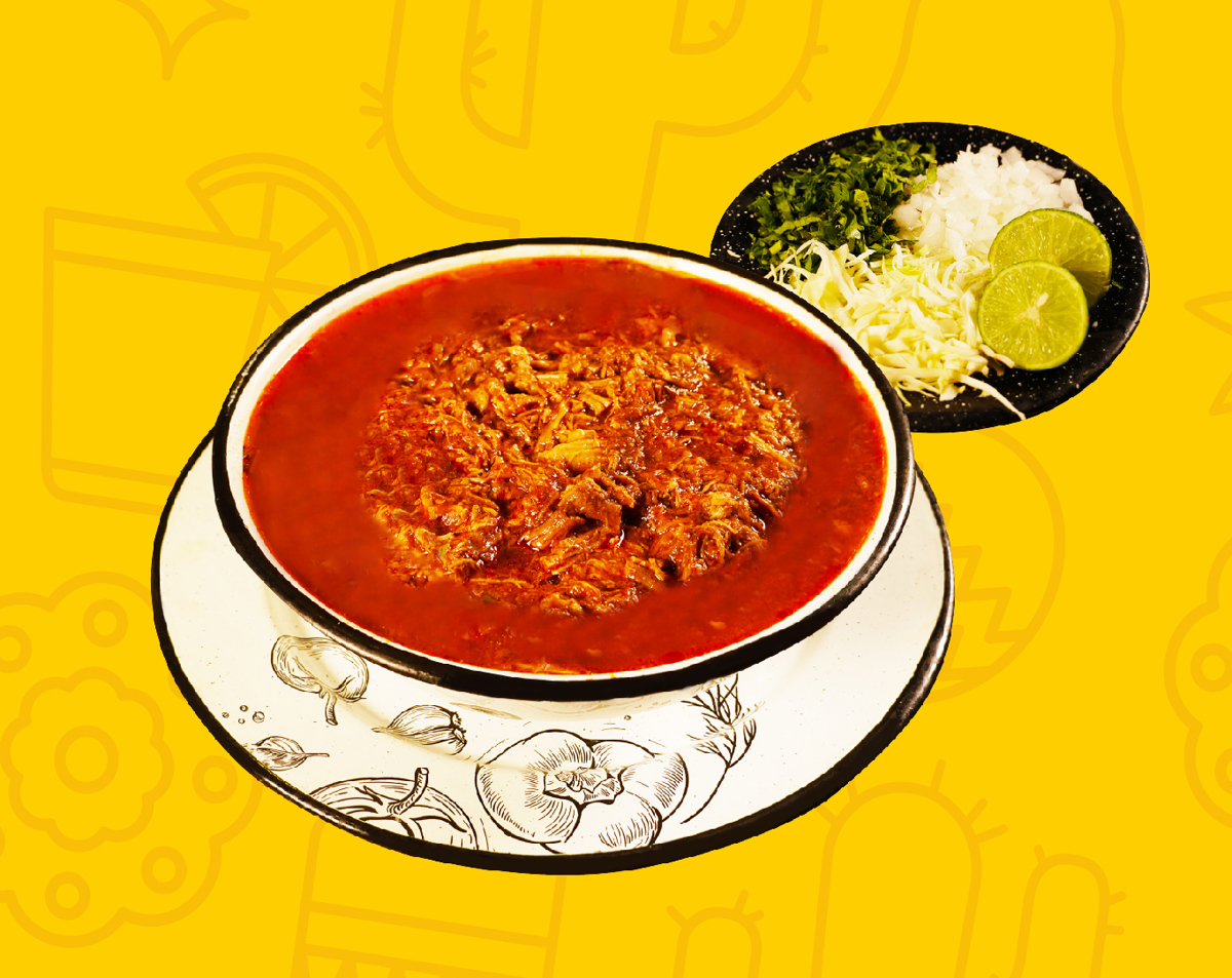 80 GM DE CARNE DE RES CON LA RECETA QUE COMBINA MAÍZ Y FRIJOL ENTEROS. SERVIDO CON CEBOLLA, CILANTRO, LIMÓN, CHILTEPÍN Y TORTILLAS DE MAÍZ.