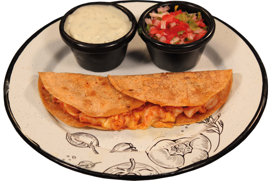 100 GM, DE CAMARÓN CON QUESO Y UN TOQUE DE CHIPOTLE, EN TORTILLA DE HARINA O MAÍZ, ACOMPAÑADO POR ADEREZO RANCH Y SALSA BANDERA.