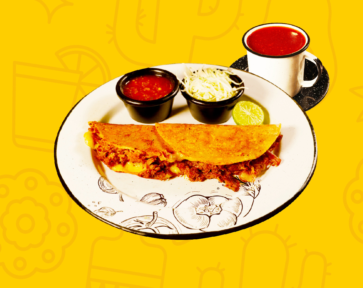 160 GM DE DELICIOSA Y JUGOSA BIRRIA EN DOS TORTILLAS GRATINADAS CON QUESO. ACOMPAÑADA DE DELICIOSO CALDO.