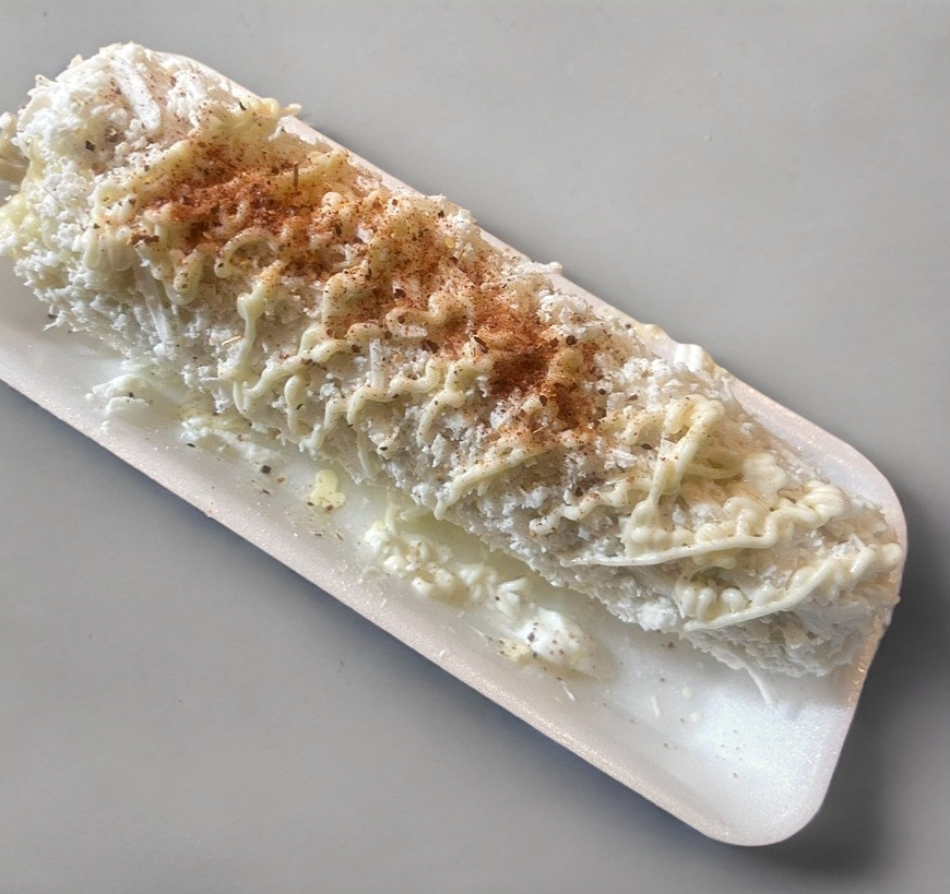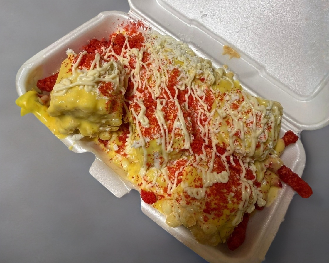 Elote entero con mantequilla,mayonesa,crema,empanizado en flaming hot con queso amarillo