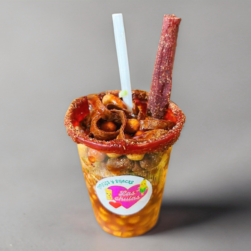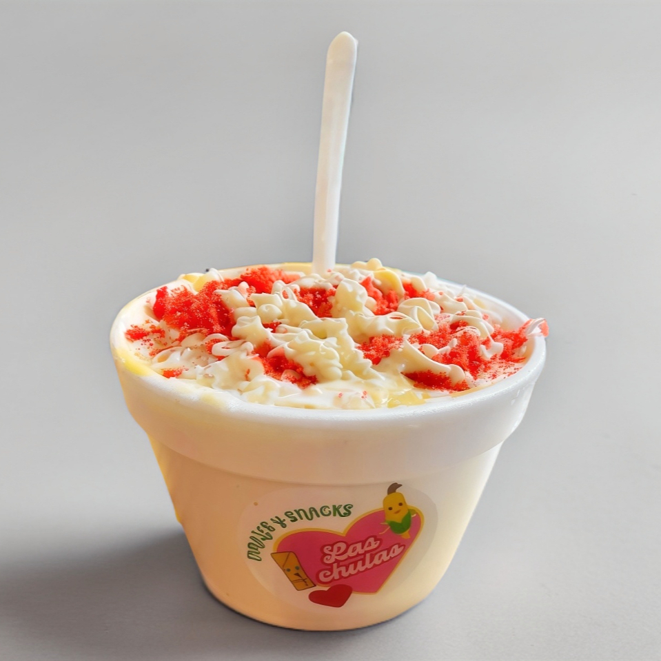 Vaso preparado con mantequilla,mayonesa,crema,queso amarillo,queso en polvo,aderezo y polvo flaming hot