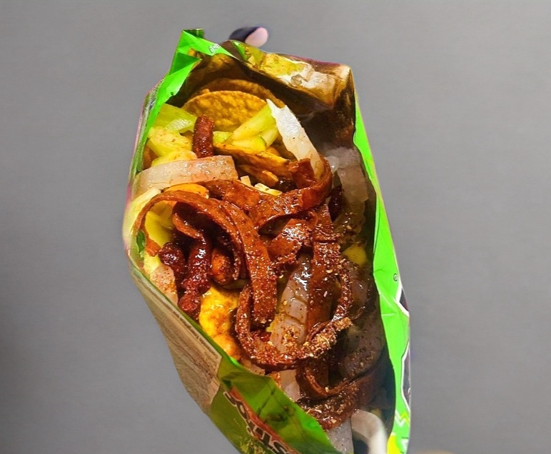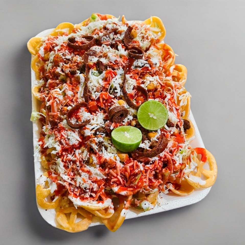 Elote partido en 4, bañado en mayonesa, crema, aderezo chipotle, queso en polvo, en una cama de sabritas a elegir le agregamos el elote, queso amarillo, queso en polvo, polvo de cheetos y mayonesa.
