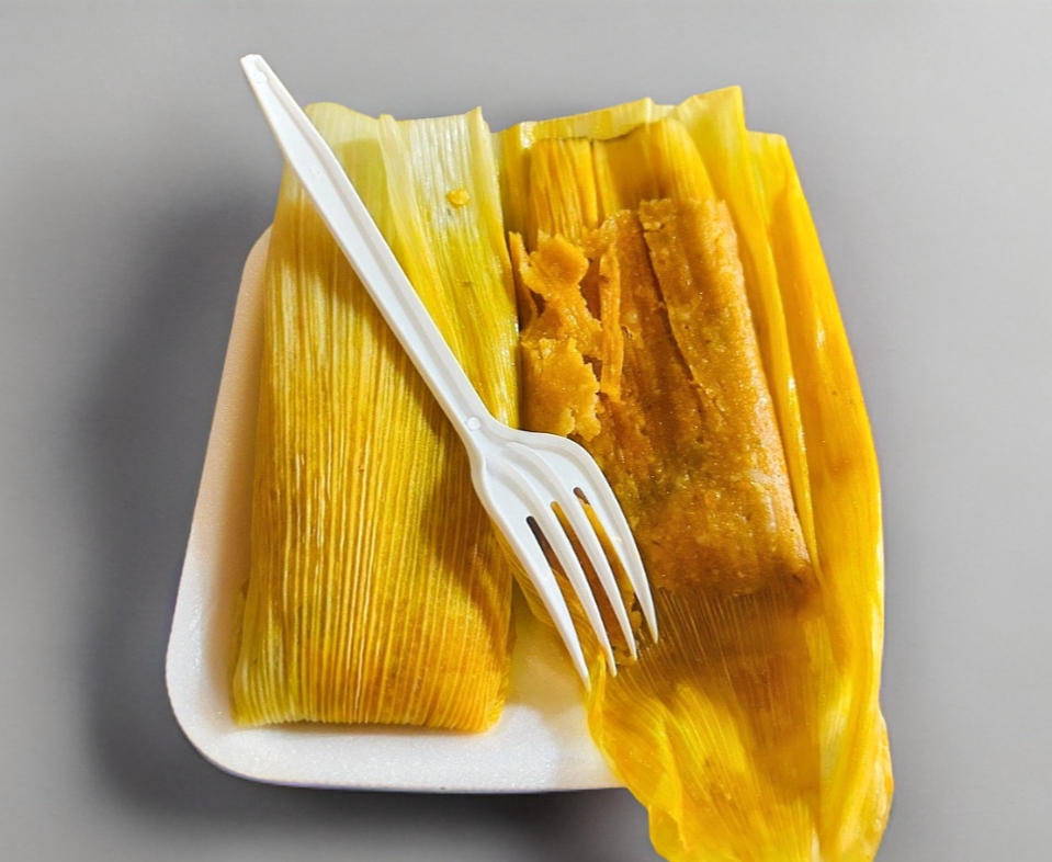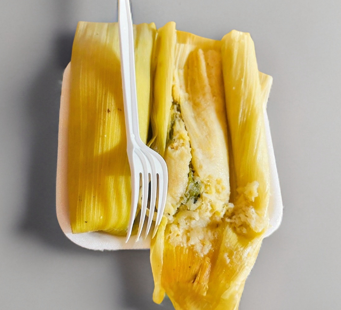 Tamal a elegir preparado con elote,crema,mayonesa,aderezo,queso amarillo, queso en polvo y salsas negras