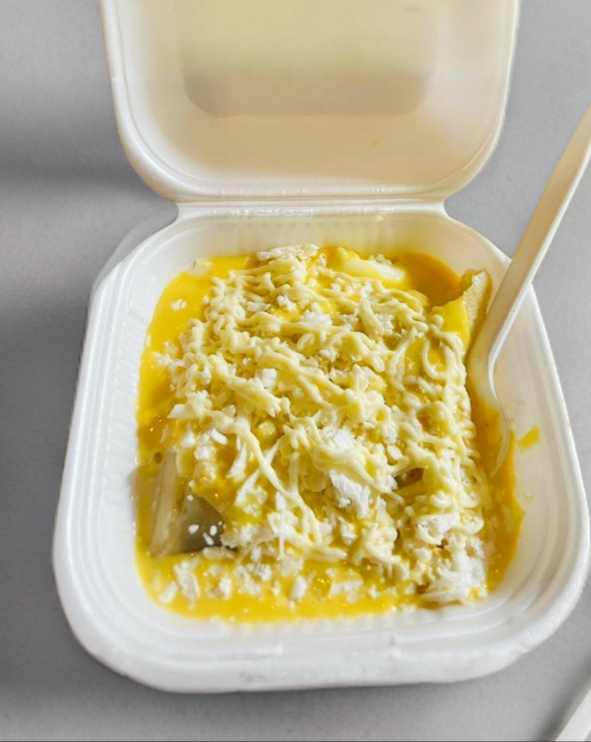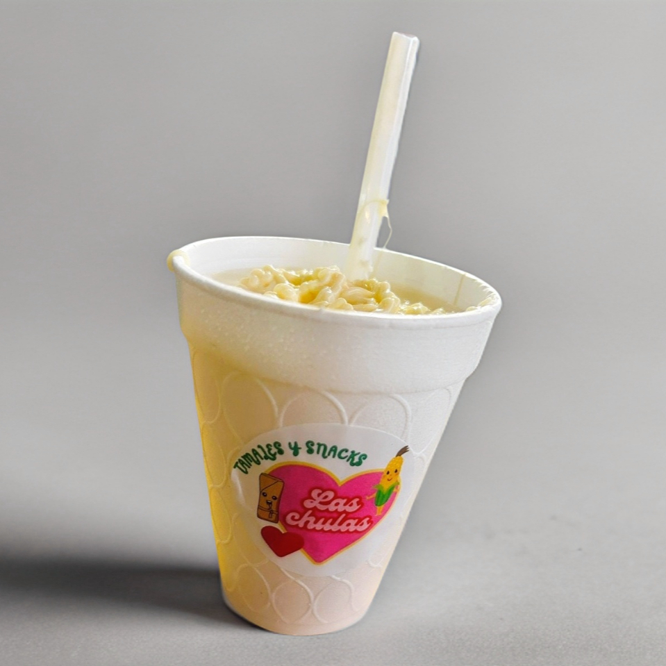 Ramen,mantequilla,mayonesa,crema,queso amarillo,queso en polvo,elote,sabritas a escoger bañadas en queso