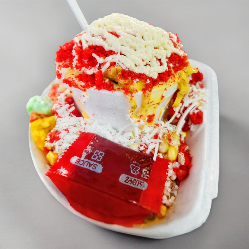 En una cama de ramen se pone un elotito partido en 4 partes revuelto en mantequilla, crema, aderezo de chipotle, mayonesa, encima se le pone queso amarillo, queso en polvo, polvo de los cheetos y mas mayonesa