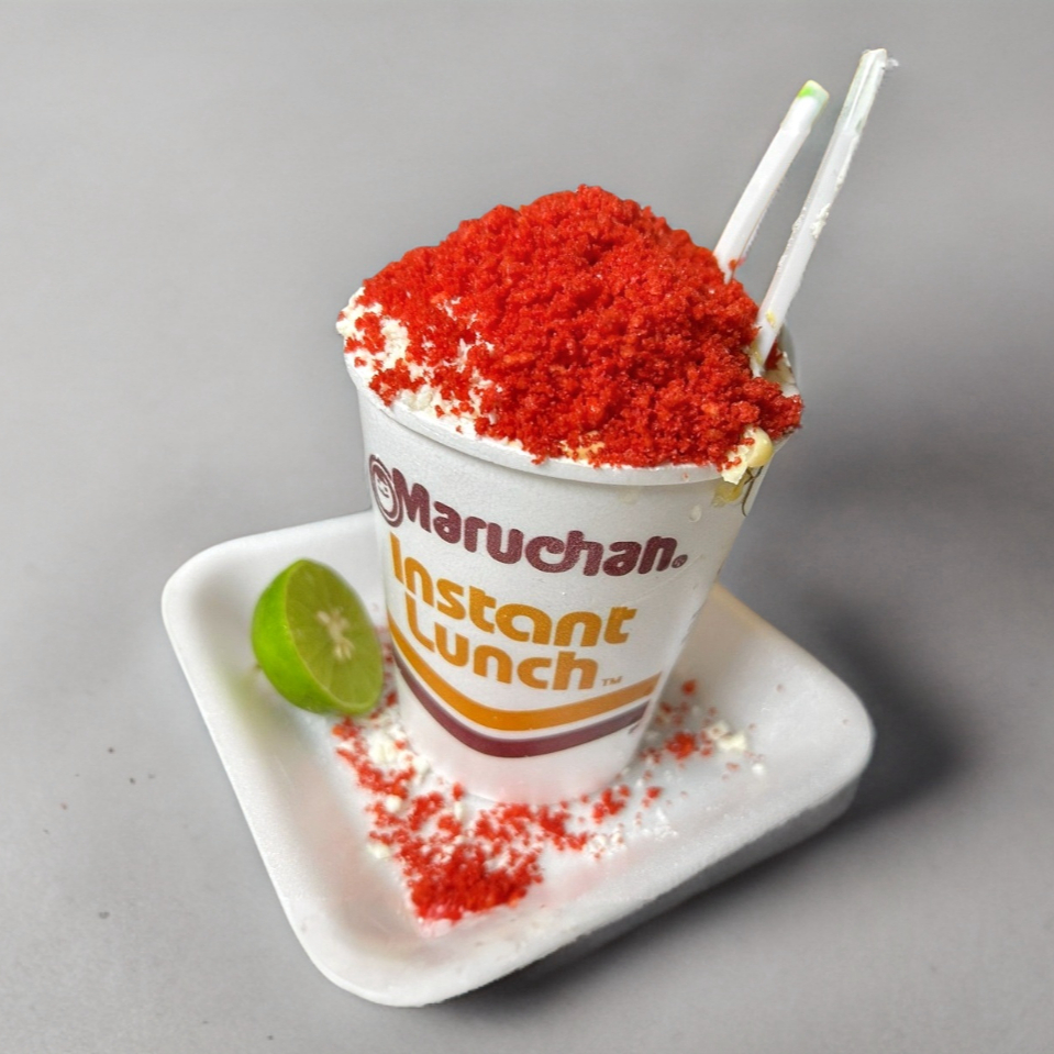Maruchan preparada con mantequilla,mayonesa,crema,queso amarillo,queso en polvo,aderezo,elote y polvo de cheetos