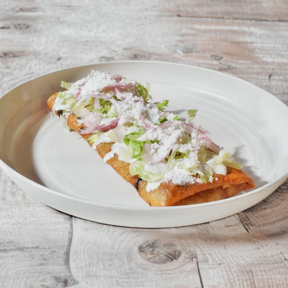 Chivichanga de papa con carne con Mayonesa, Lechuga, Cebolla Morada, Media Crema y Queso