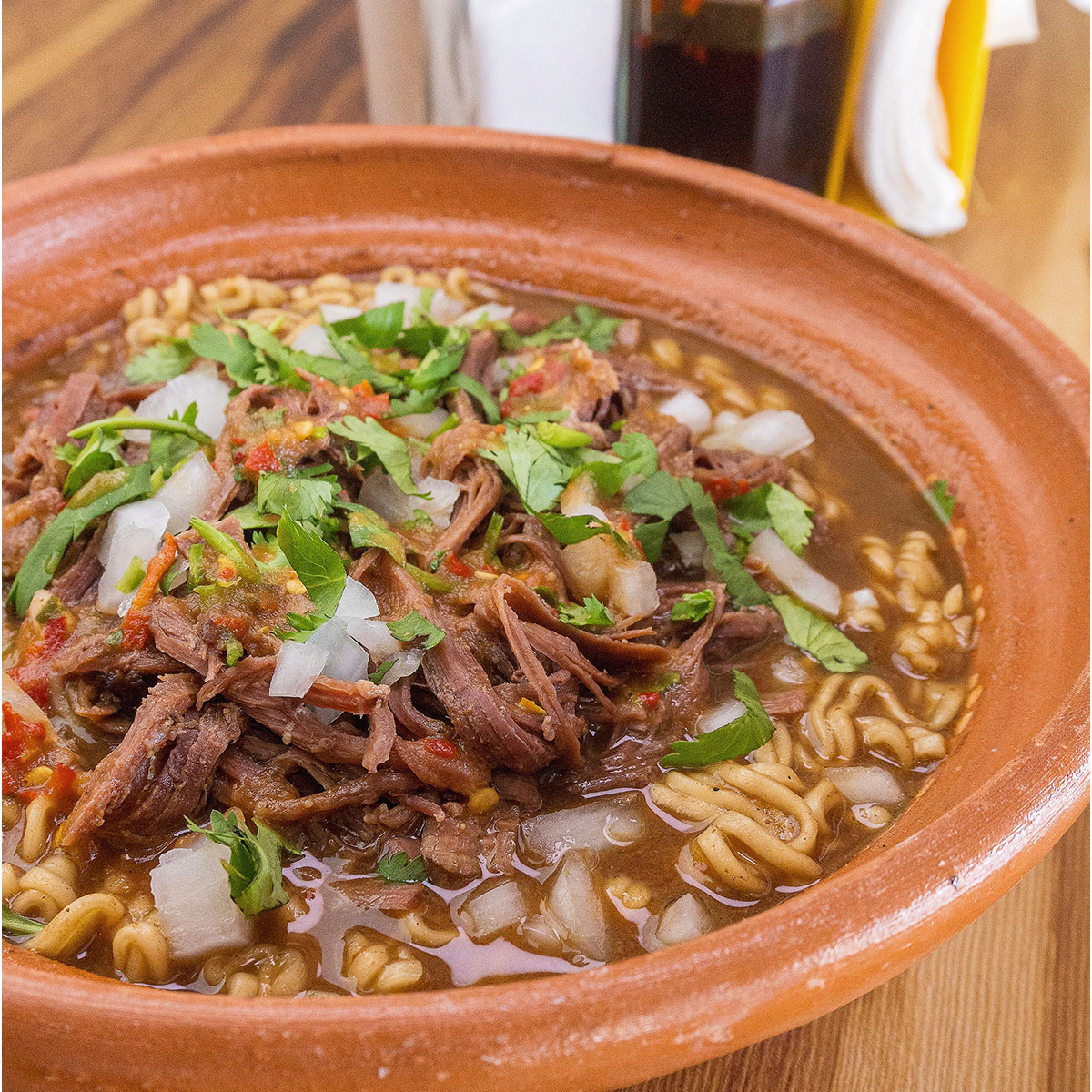 Sabroso litro de birria de res en caldo, ramen, acompañada con salsa, verdura y 6 piezas de tortillas de maíz.