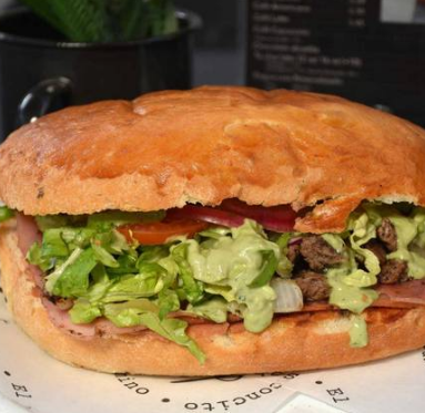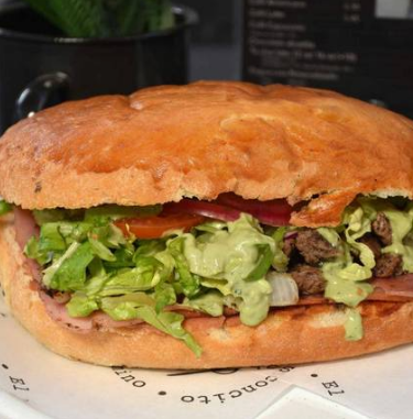 Pan regional con base de frijol, pierna adobada, mix de verduras, salsa de aguacate y salsa de ahogo.